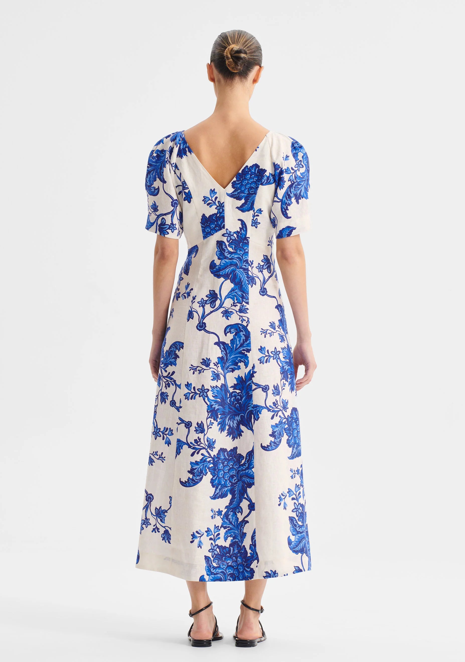 The Bonita Linen Dress showcases an exclusive Morrison print on 100% Linen. Designed with a V-neckline, soft raglan sleeves, and fitted bodice, it falls to a midi-length A-line skirt with panel construction, balancing structure and ease.