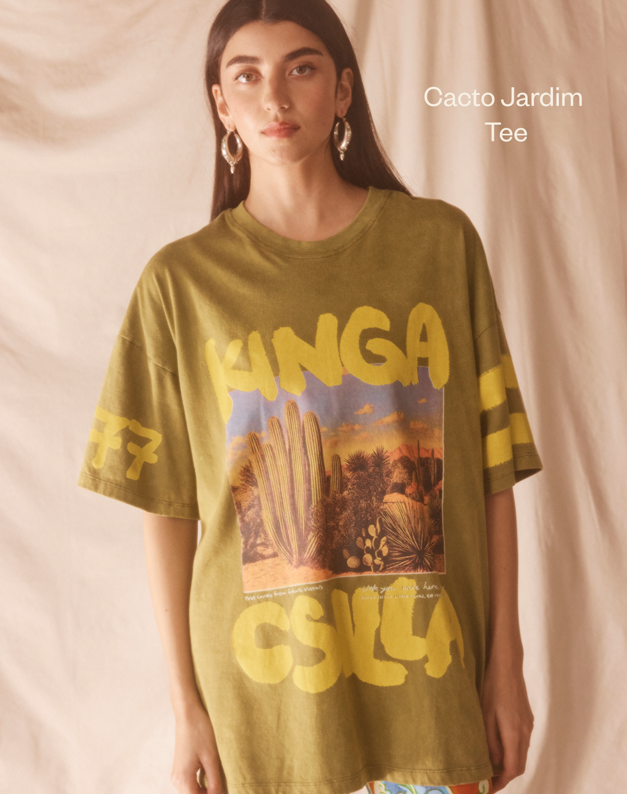 The Cacto Jardim Tee in lime green is a bold celebration of slow-made fashion and wanderlust spirit. This oversized graphic tee features an artful collage of desert landscapes, capturing the essence of sun-soaked adventures and effortless resort style. With its relaxed silhouette and eye-catching print, this handcrafted piece transitions seamlessly from beachside mornings to evening gatherings.