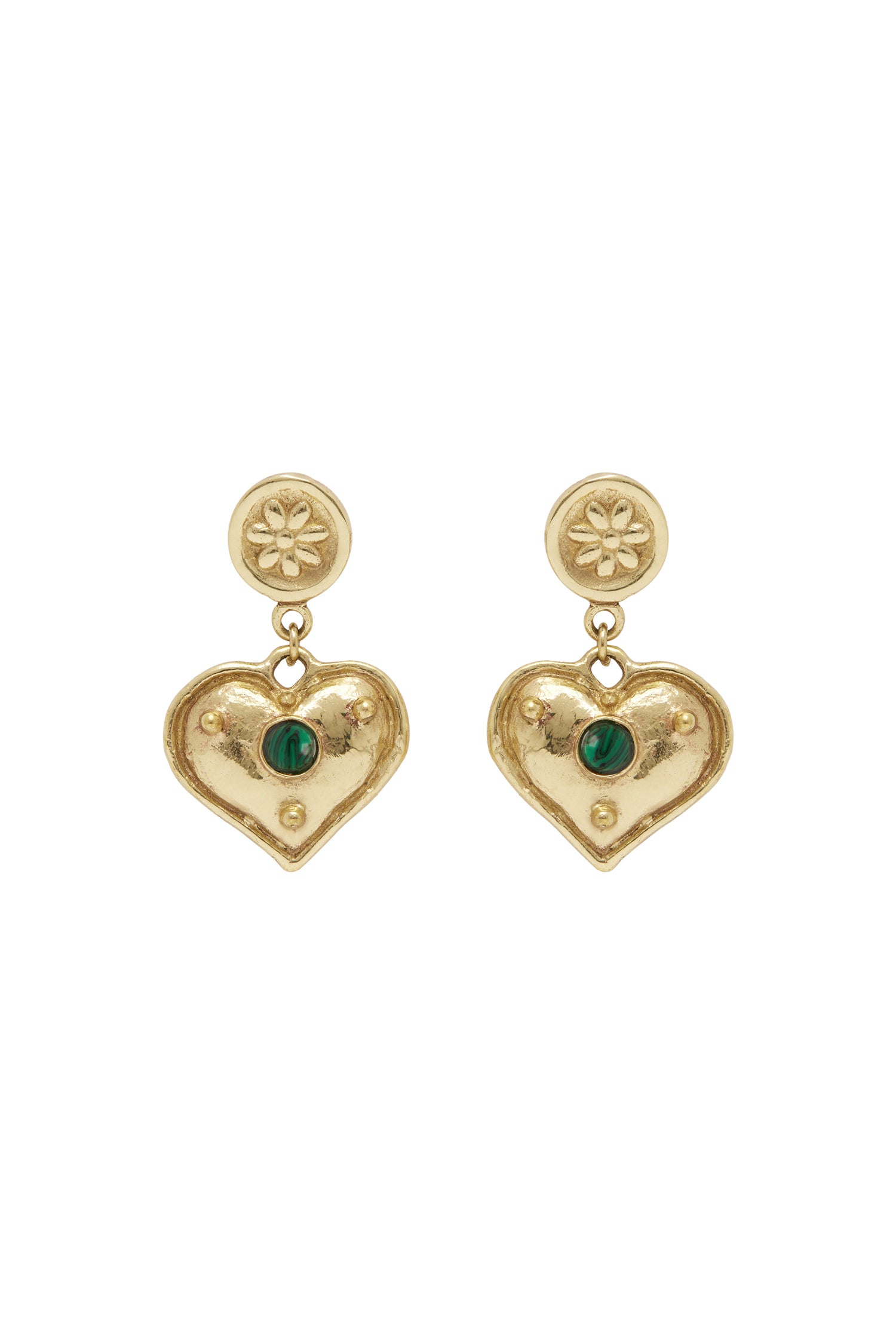 The Alemais Jem Heart Earrings bring a playful touch of elegance to any look. Each sculptural heart charm is set with a striking malachite stone, adding a vibrant pop of natural colour and a beautifully organic feel.