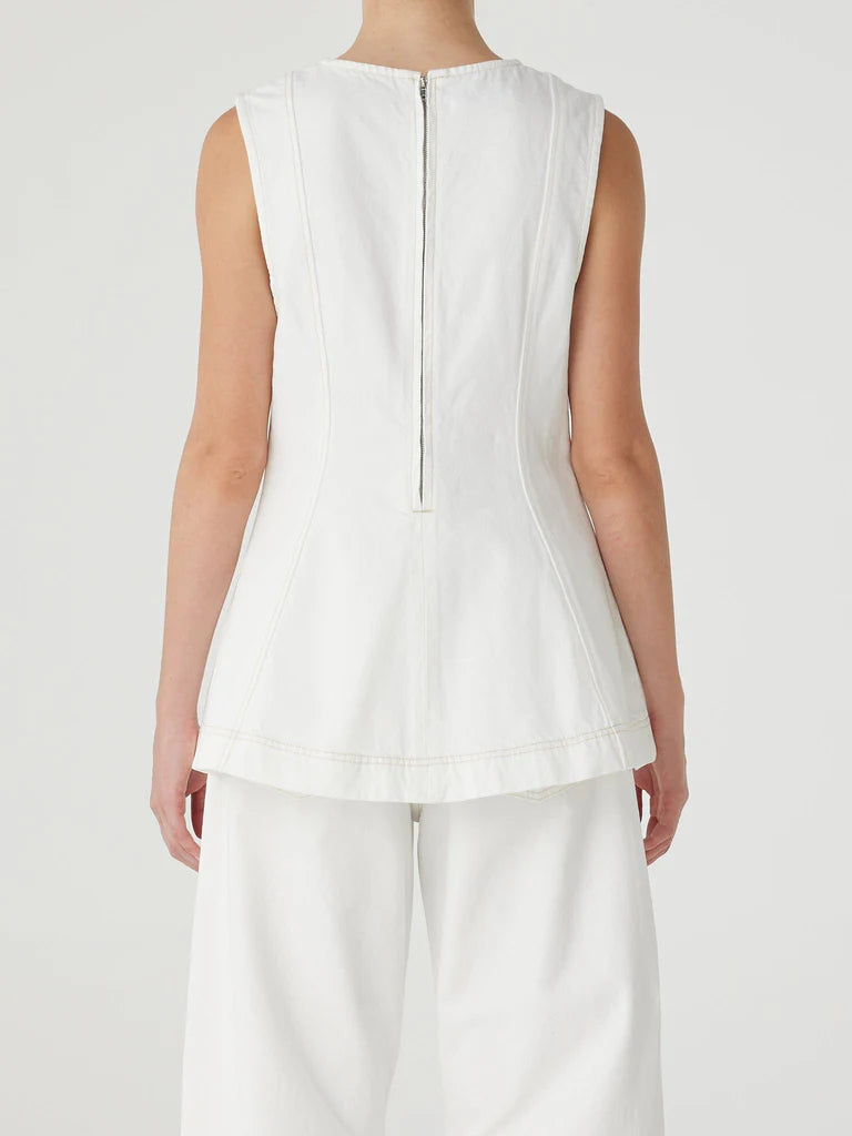 Nobody Denim's dreamy top. The Lucille Top is sleeveless, tapers in at the waist, then flares out at the hip for a unique hourglass silhouette. Featuring vertical seaming and back zip opening. Crafted from premium rigid denim.